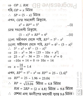 5) একটি পার্কে 5 মিটার ব্যাসার্ধের একটি বৃত্ত অঙ্কন করে তার ওপর দাঁড়িয়ে তিনজন বালিকা রেশমা, সালমা এবং মনদিপ খেলা করছে । একটি বল রেশমা সালমাকে, সালমা মনদীপকে, মনদীপ রেশমাকে ছুঁড়ে দিচ্ছে। যদি রেশমা ও সালমা এবং সালমা ও মনদীপ প্রত্যেকের মধ্যবর্তী দূরত্ব 6 মিটার হয়, তবে রেশমা এবং মনদীপ এর মধ্যবর্তী দূরত্ব কত? [ CBSE - 1999 ]
